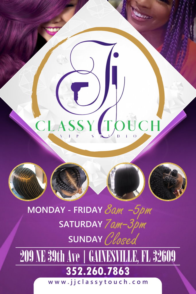Jasmine Jones also known as JJ is the Owner and Ceo of JJ Classy Touch Vip Studio located in Gainesville Fl. She has been in the hair industry for six year and has established skills and knowledge, as well as a consistent clientele. JJ @ JJCLASSYTOUCH Vip Studio being her newest endeavor opened September 1st 2020. Before opening her shop she spent her time learning along with different stylists.
